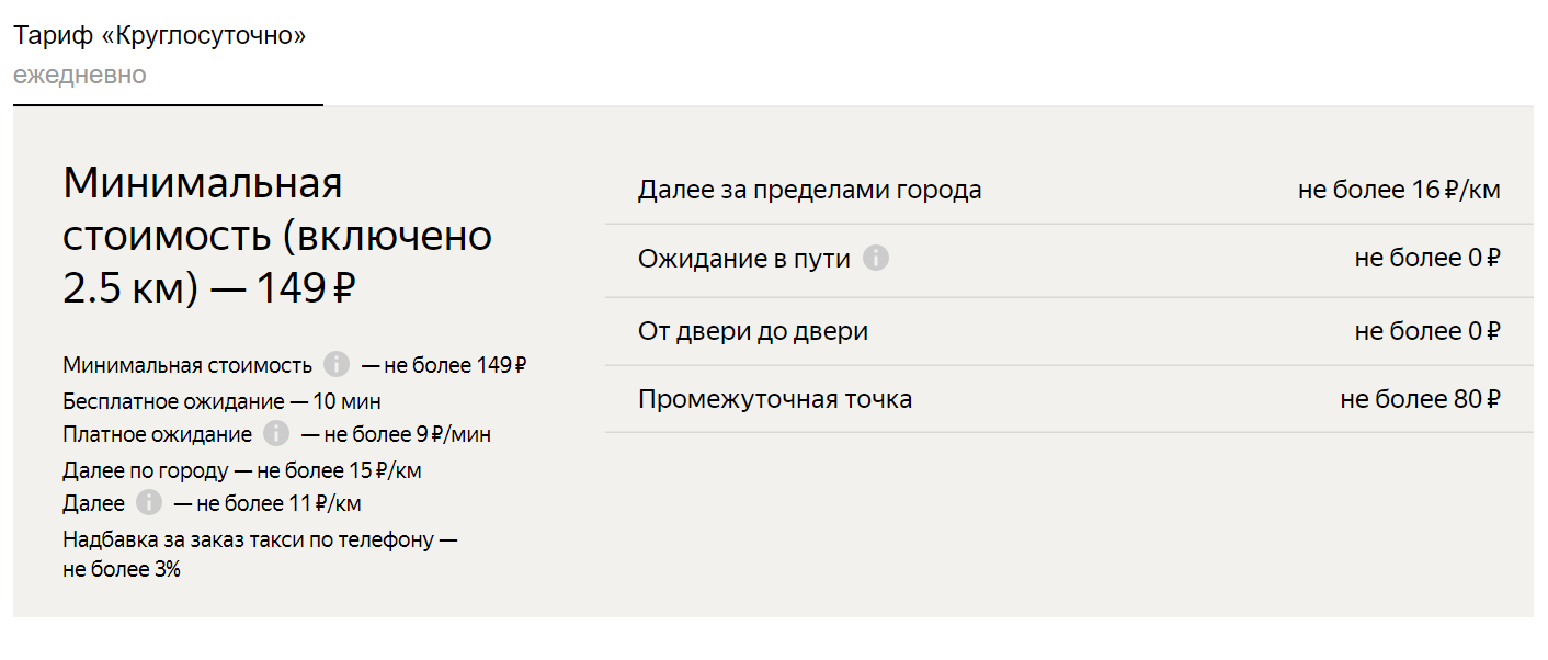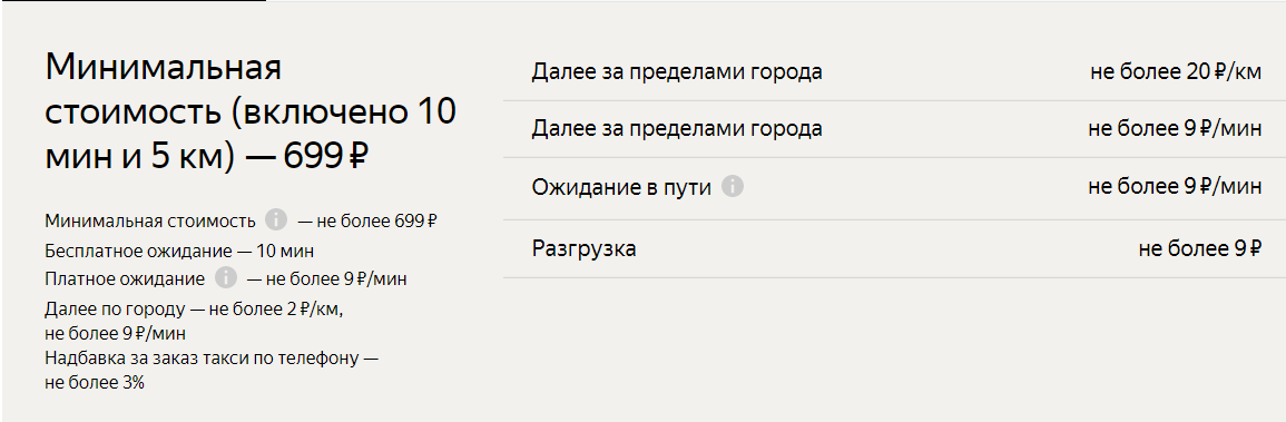 - цена увеличивается в случае превышения лимита минимальной стоимости, при ожидании в точке подачи сверх бесплатного периода или ожидании в пути.